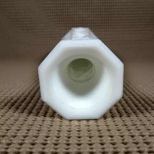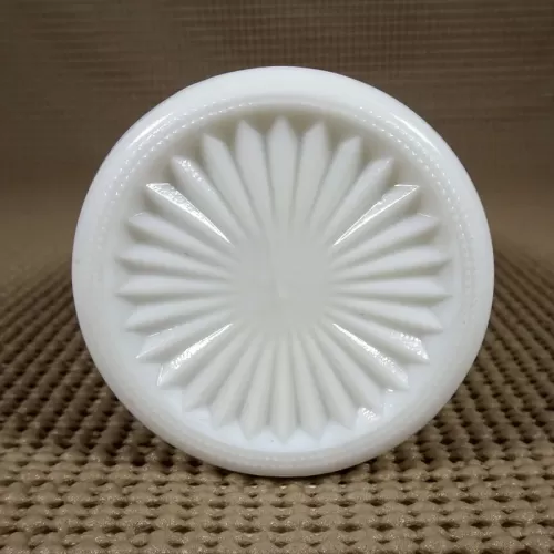 Vintage milk glass bud vase with fluted octagon top and diamond starburst design. The round base and sunray pattern on the bottom add to the look.