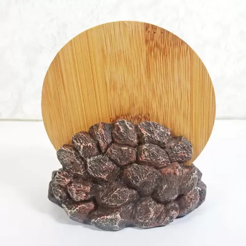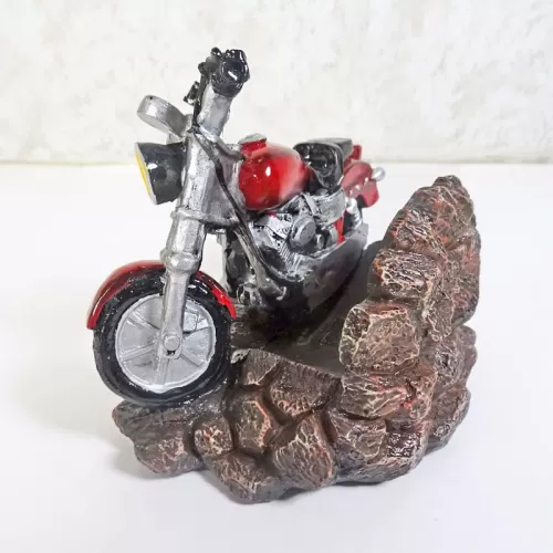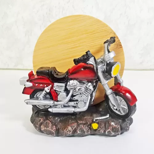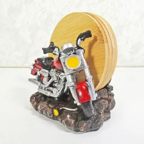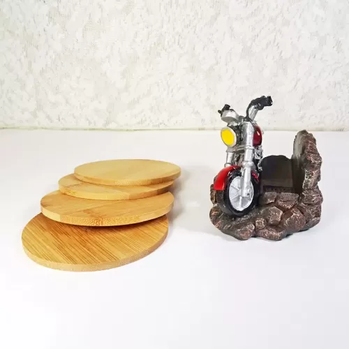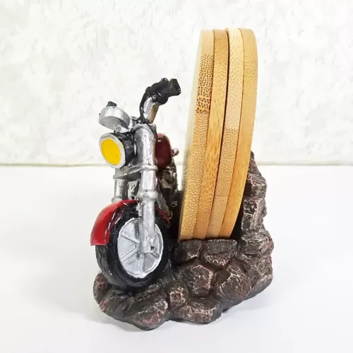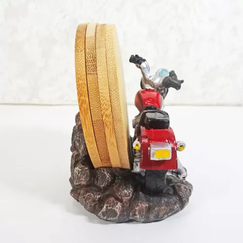 Coaster set featuring a polyresin motorcycle figurine and four bamboo coasters