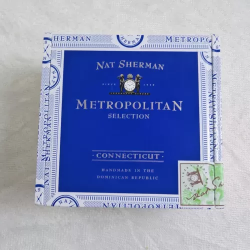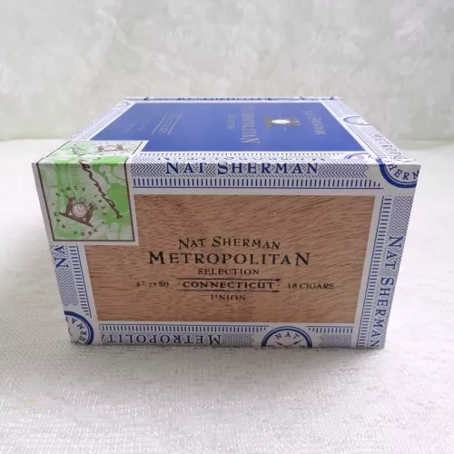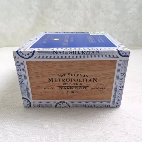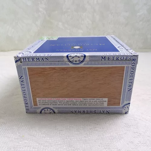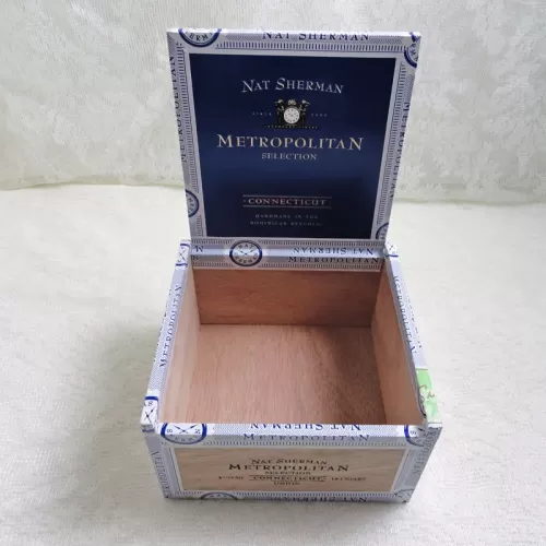 Nat Sherman vintage empty wood cigar box featuring paper lined lid and edges