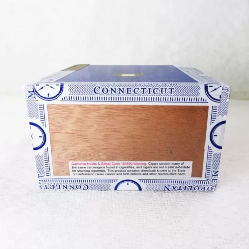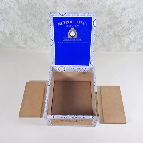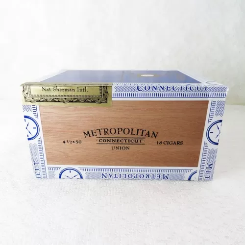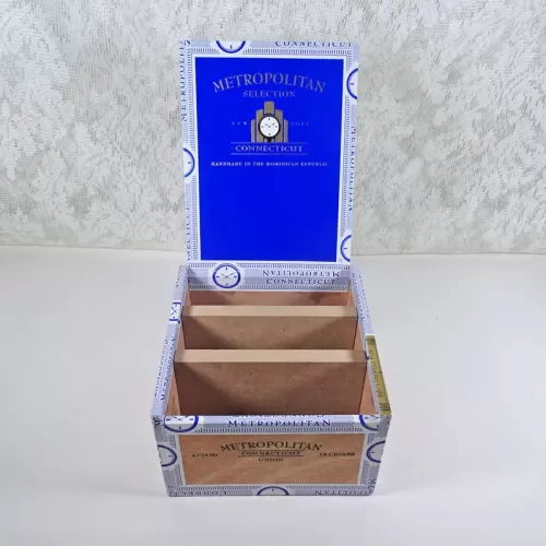 Nat Sherman vintage empty wood cigar box featuring paper lined lid and edges. Two wood dividers are included.