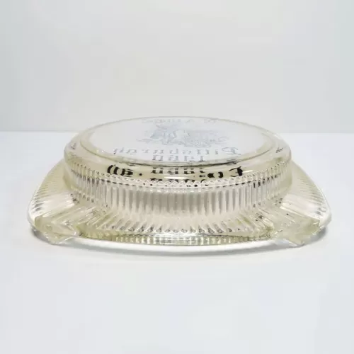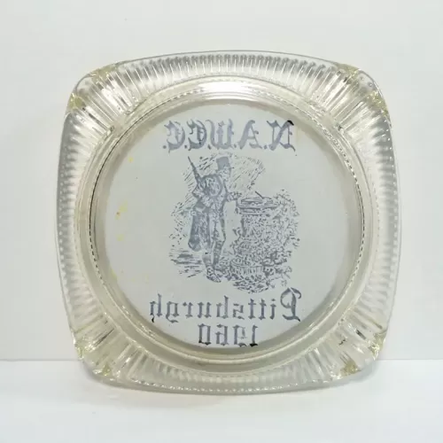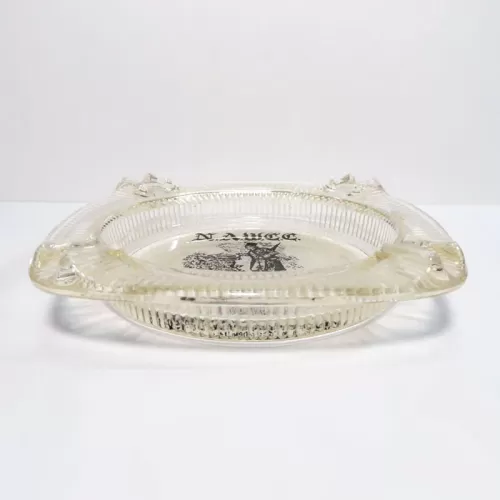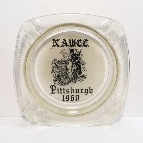 National Association of Watch and Clock Collectors clear glass square ashtray with rounded corners, four cigarette rests and black graphics