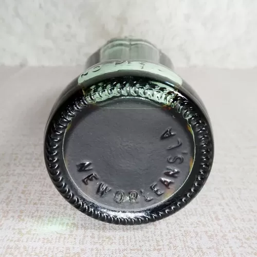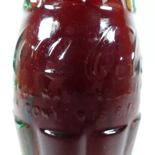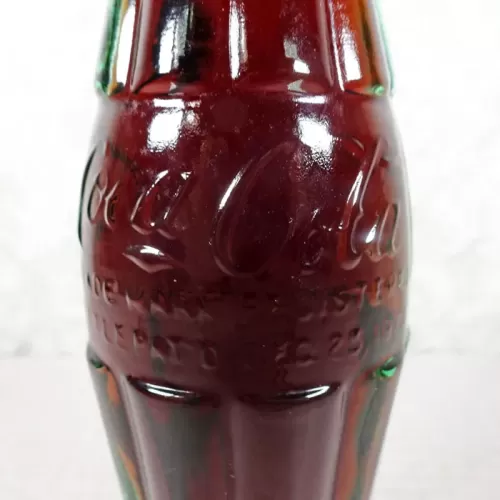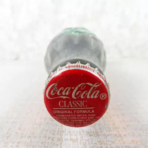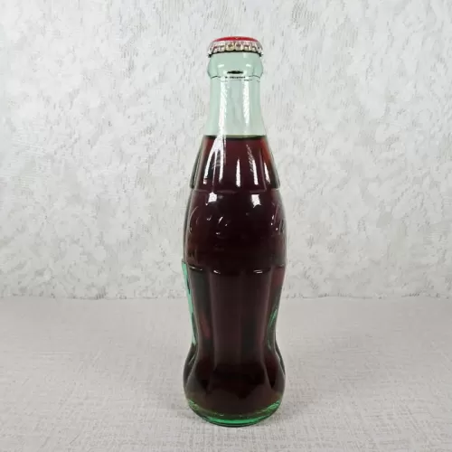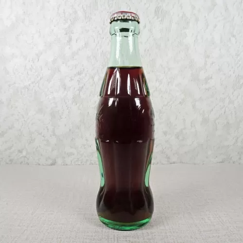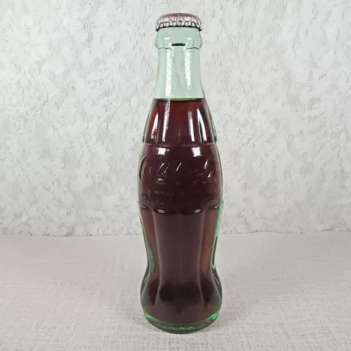 Coca Cola aqua green embossed vintage hobbleskirt glass soda bottle with a red Coca Cola Classic Original Formula crown sealed cap