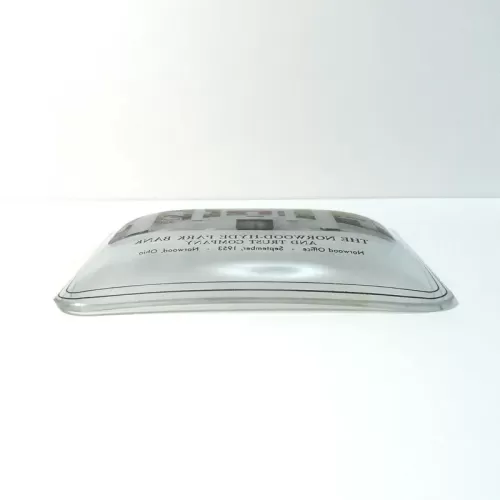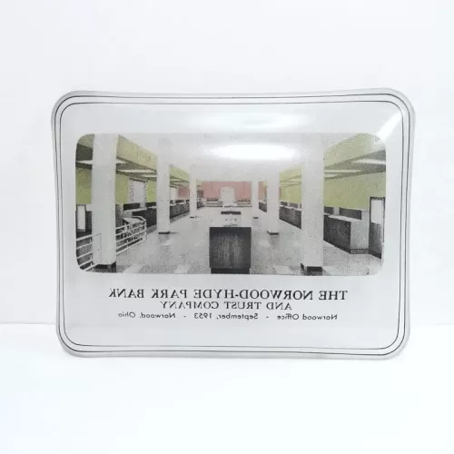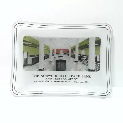 Vintage 1953 Norwood-Hyde Park Bank and Trust Company vintage ashtray in Norwood, Ohio. Features curved or bent glass with a colored image and black graphics along with a translucent white background. Depicts the lobby of the bank. Kinda weird looking at it knowing actual people walked thru that bank lobby in 1953