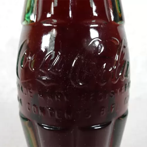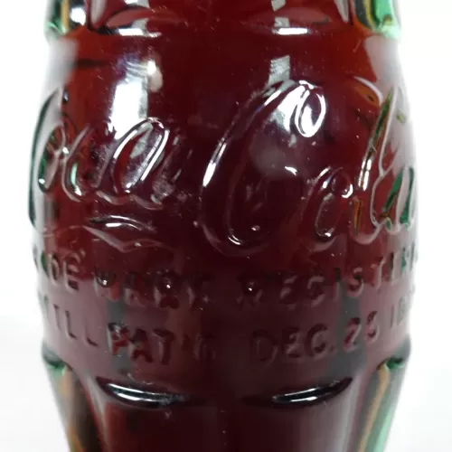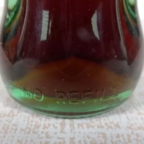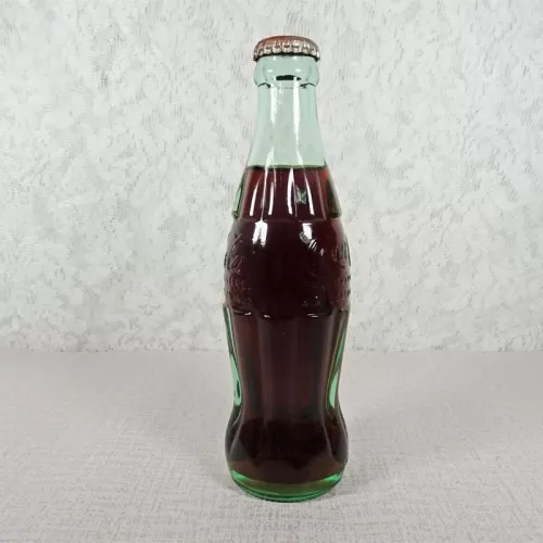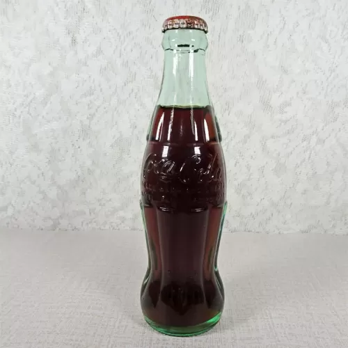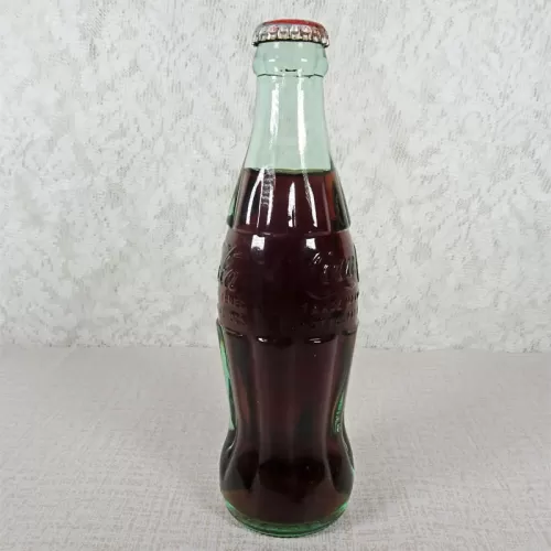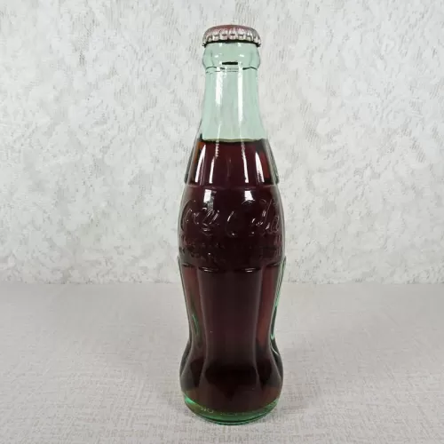 Coca Cola aqua green embossed vintage hobbleskirt glass soda bottle with a red Coca Cola Classic Original Formula crown sealed cap