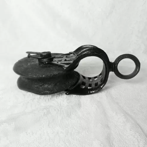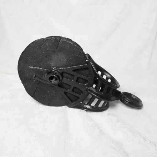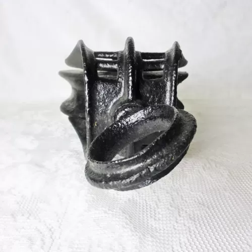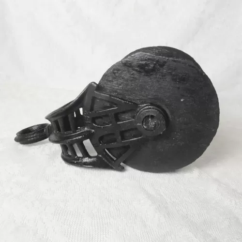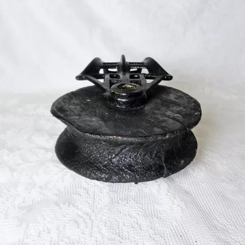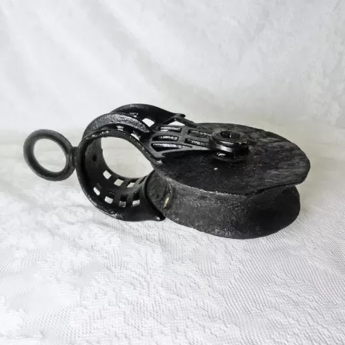 Vintage wood pulley with approximate 5-1/2 inch wood wheel and metal cast iron case or frame with swivel eye.