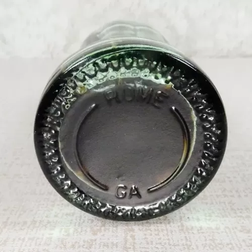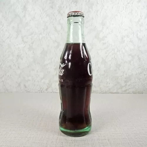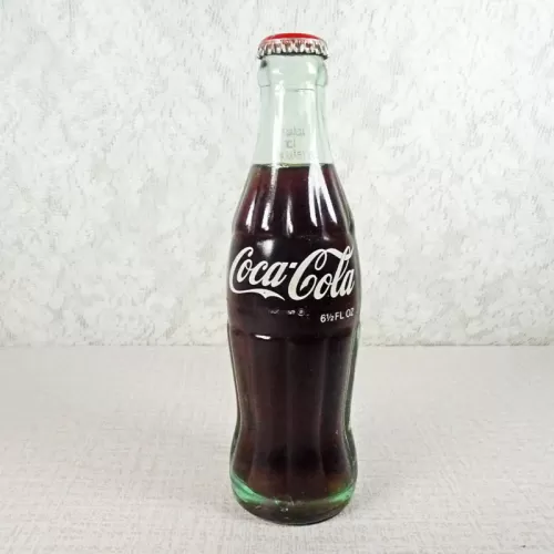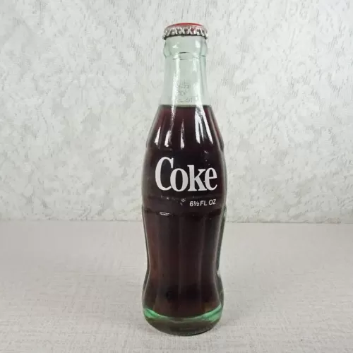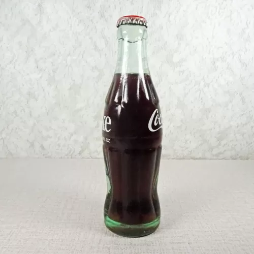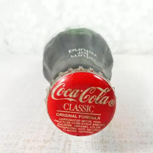 Coca Cola aqua green embossed vintage hobbleskirt glass soda bottle with a red Coca Cola Classic Original Formula crown sealed cap and white painted graphics