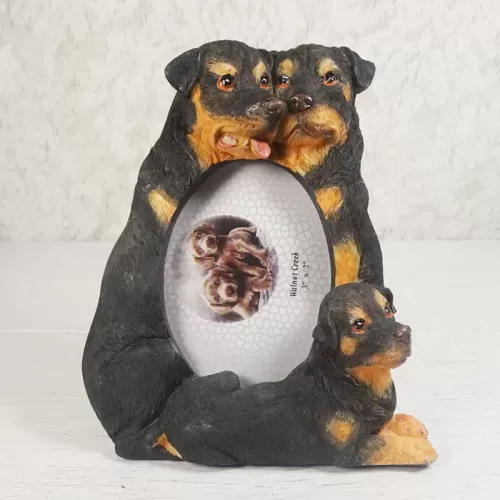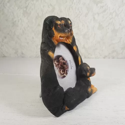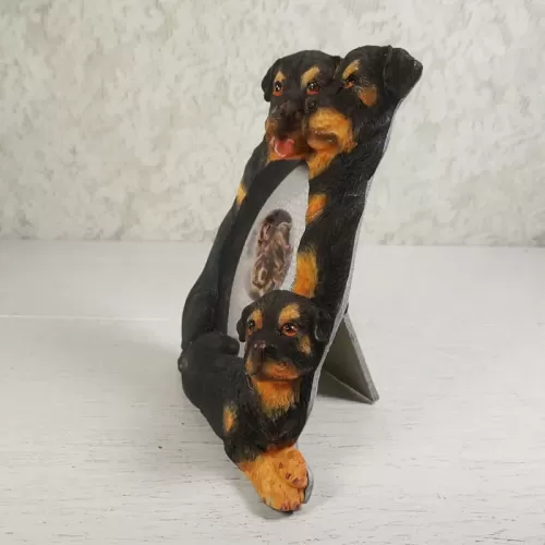 Rottweiler dogs and puppy photo frame in a highly detailed, life like, 3D polyresin figurine style