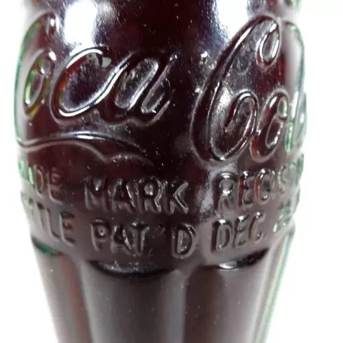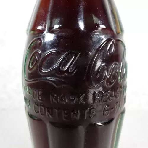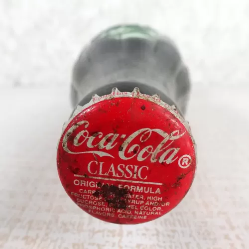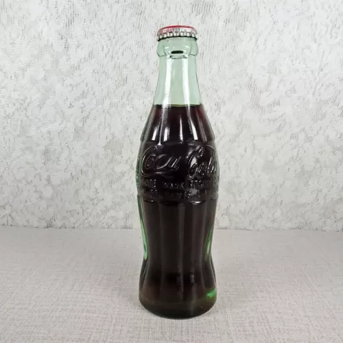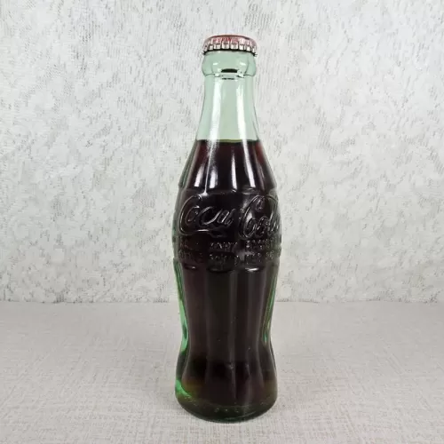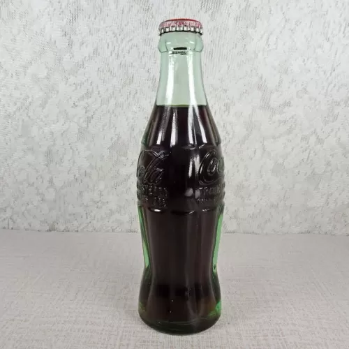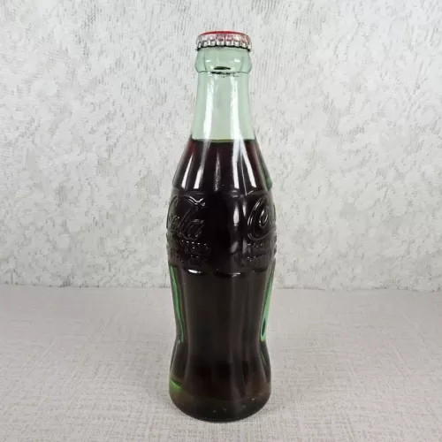 Coca Cola aqua green embossed vintage hobbleskirt glass soda bottle with a red Coca Cola Classic Original Formula crown sealed cap