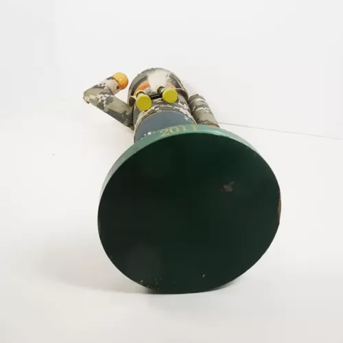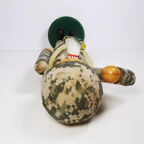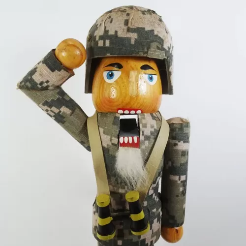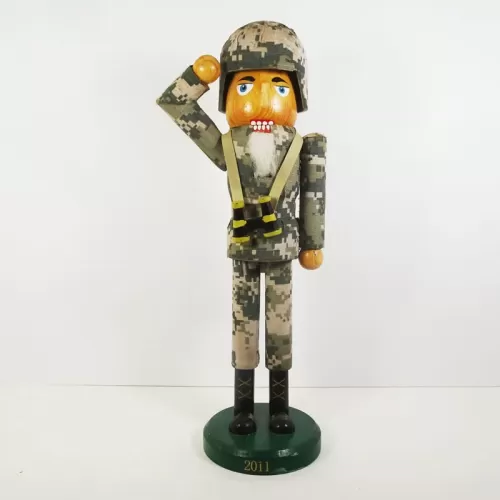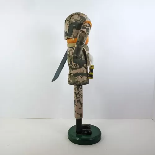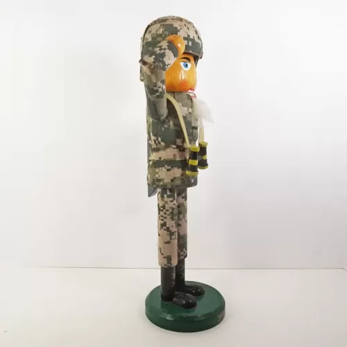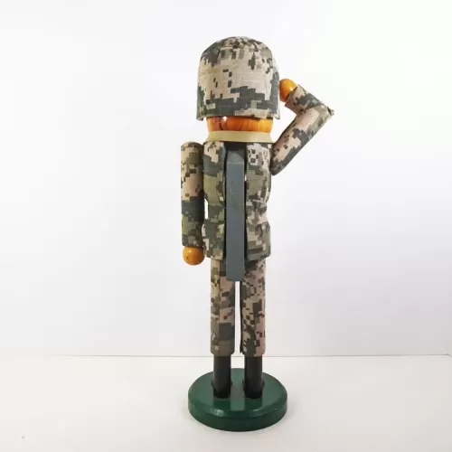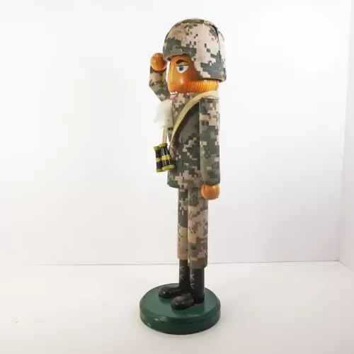14 inch wood nutcracker featuring a saluting American soldier in camouflage wearing a helmet with binoculars hanging from his neck.