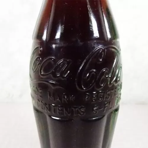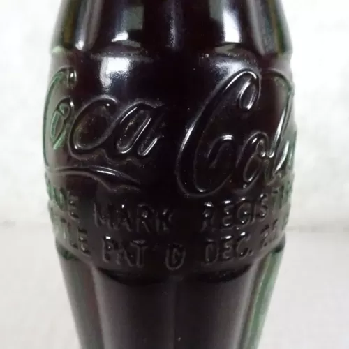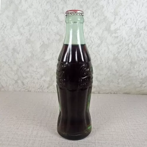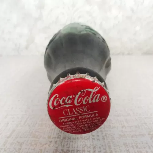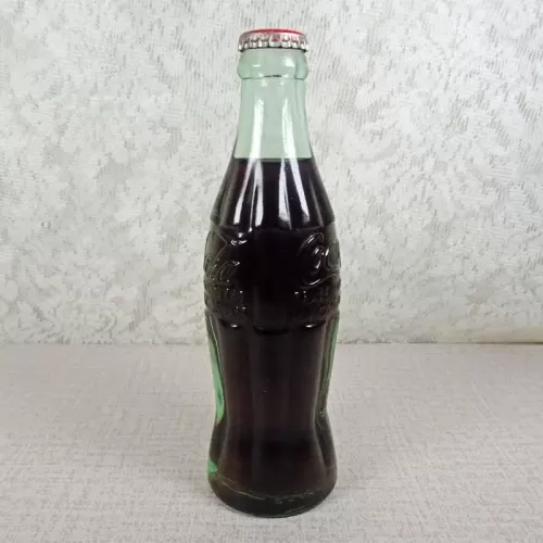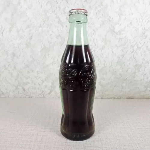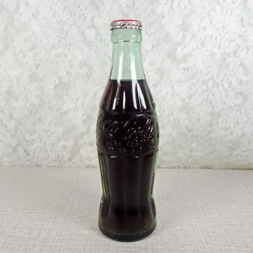 Coca Cola aqua green embossed vintage hobbleskirt glass soda bottle with a red Coca Cola Classic Original Formula crown sealed cap