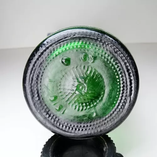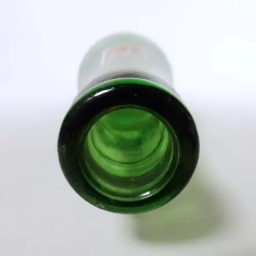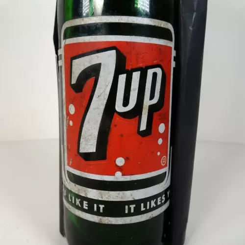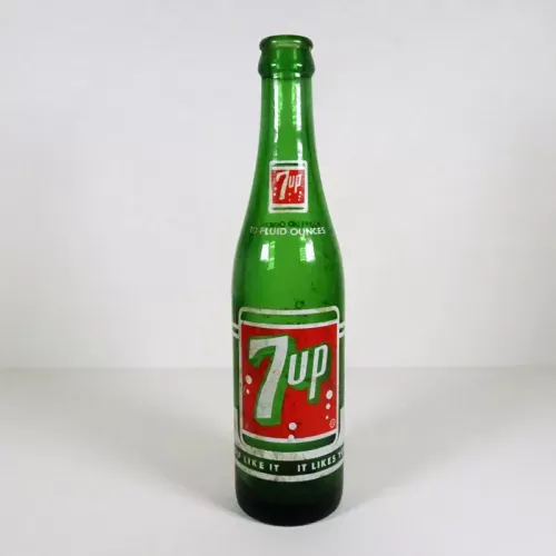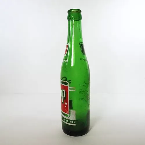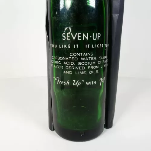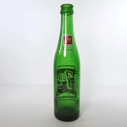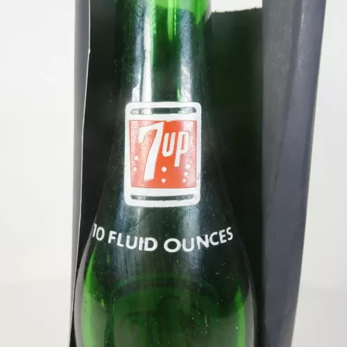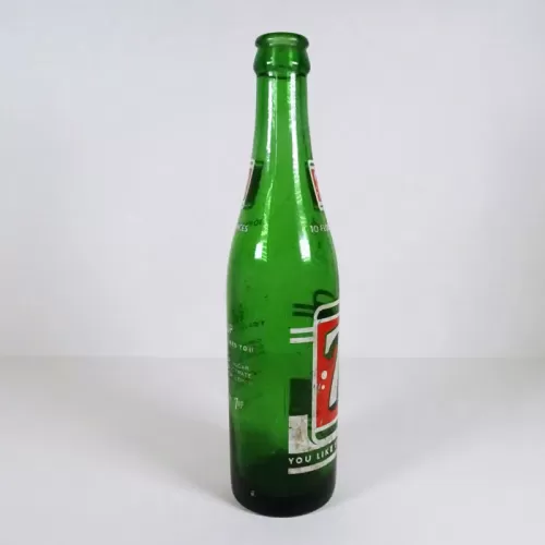 Seven Up 10 oz. empty soda bottle with the iconic seven bubble logo. Green glass with red and white ACL graphics