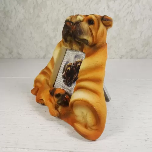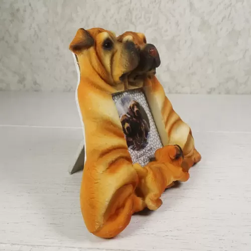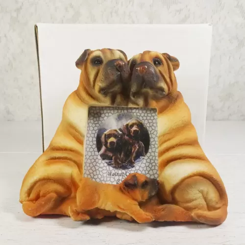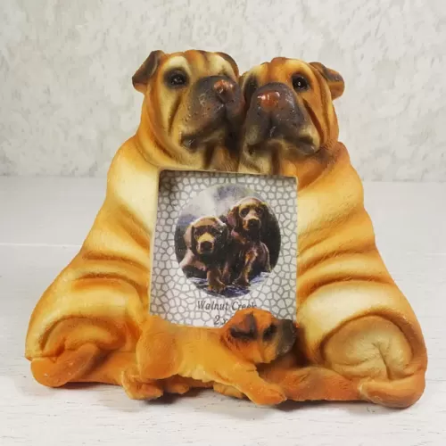 Shar Pei dogs and puppy photo frame in a highly detailed, life like, 3D polyresin figurine style