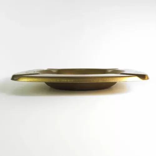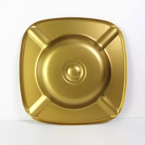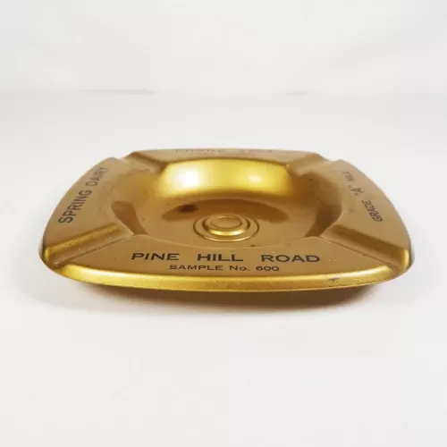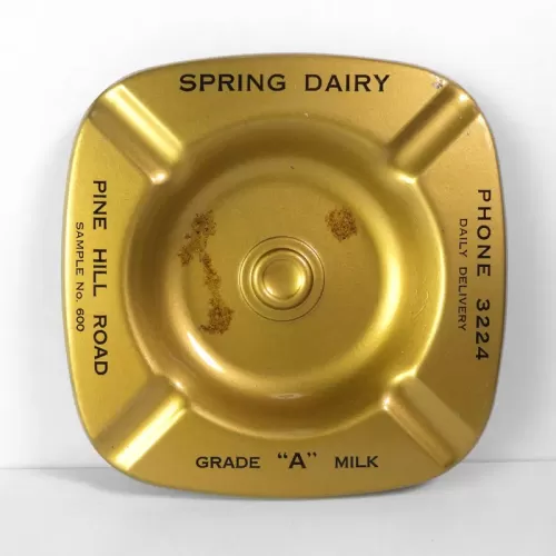 Spring Dairy vintage Salesman Sample No.600 metal ashtray. Gold with very nice black graphics. Features a square design with round corners and four cigarette rests