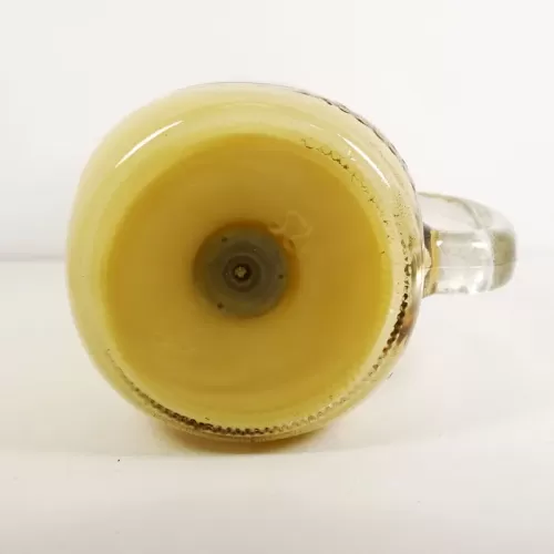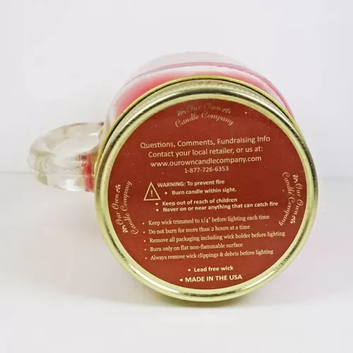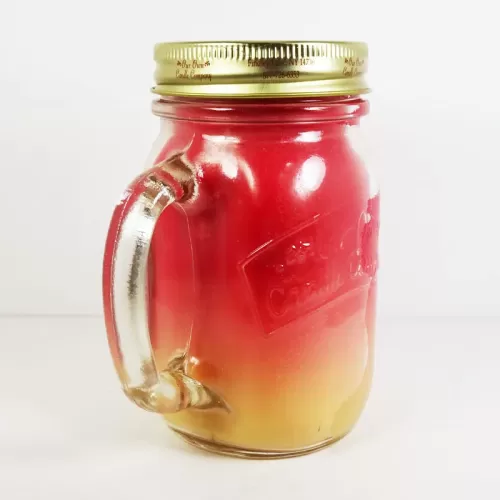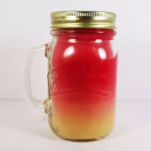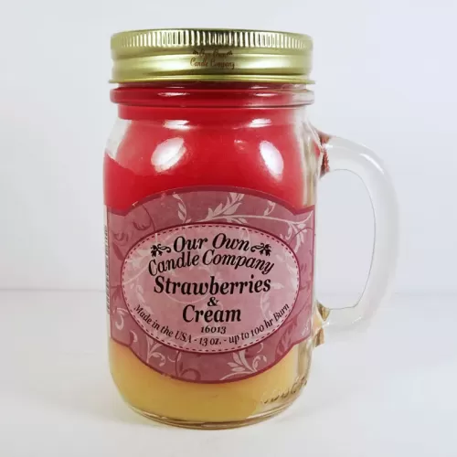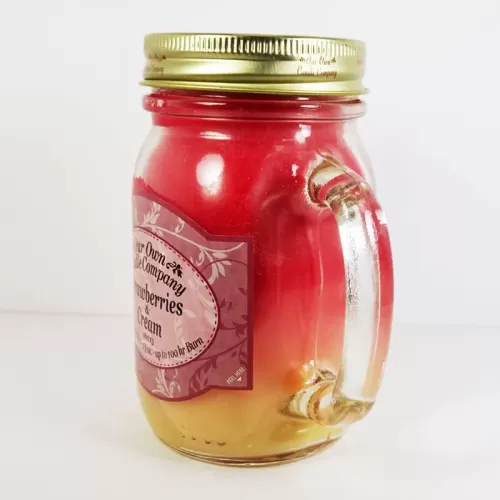 Strawberries and Cream 13 oz. scented candle in a large glass mug with handle. Blending colors of red and yellow add to the look