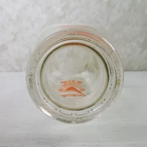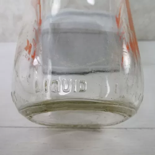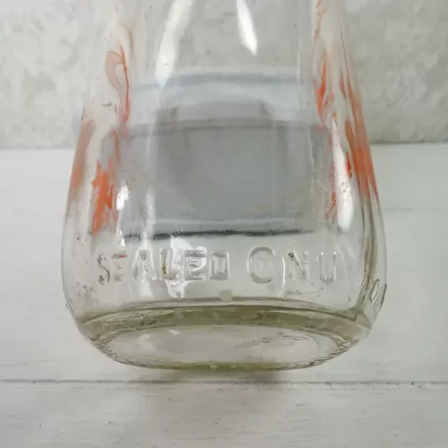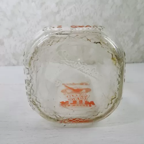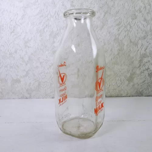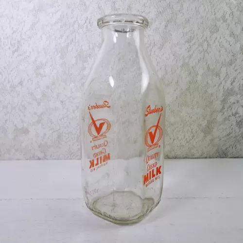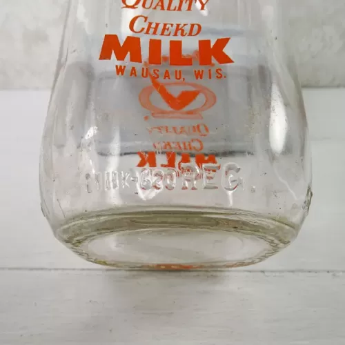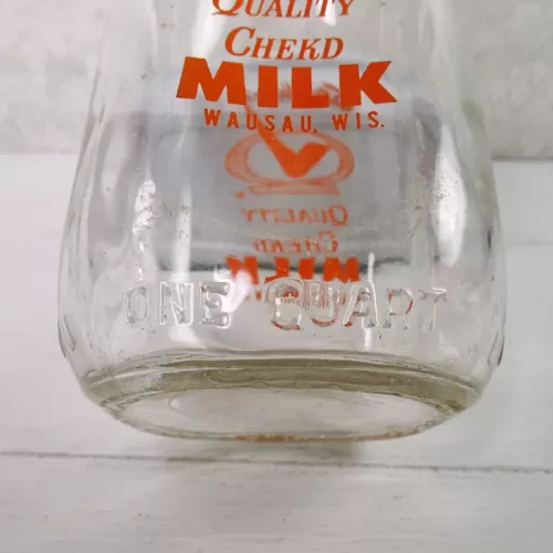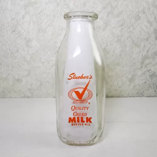 Vintage 1961 Stueber's Wausau Wis. one quart pyro ACL glass milk bottle featuring the name and location, plus a large Q with a checkmark thru it and the words Quality Chekd on the front and back of the bottle