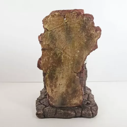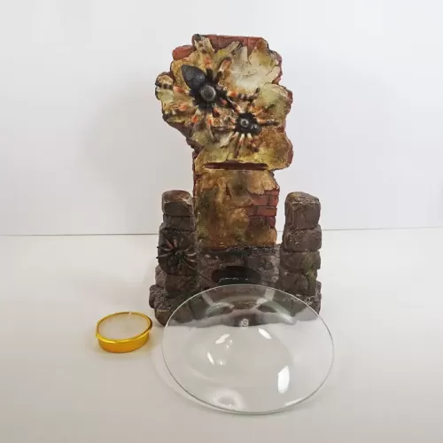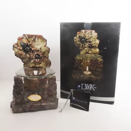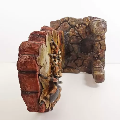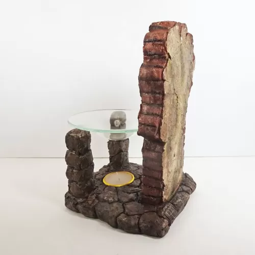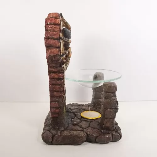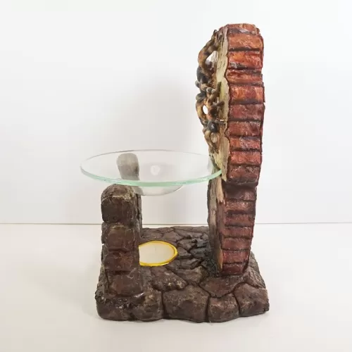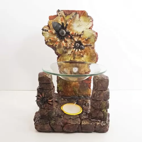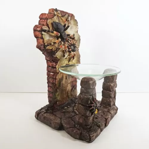 Fragrance warmer featuring a polyresin figurine of life-like tarantulas on a crumbling old brick wall