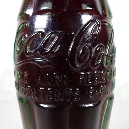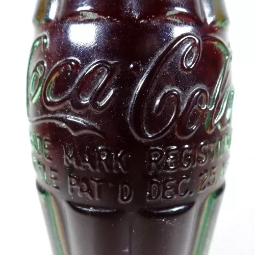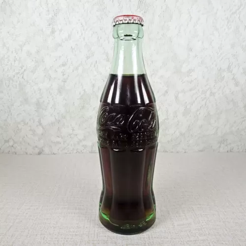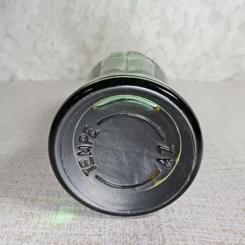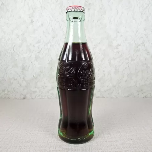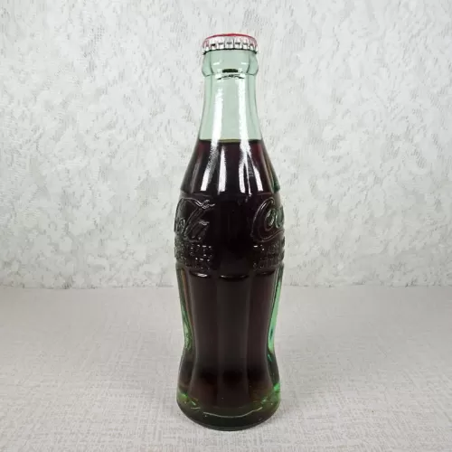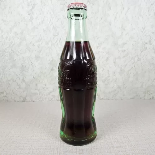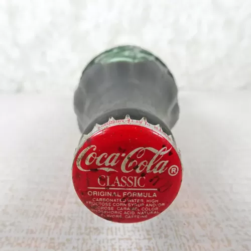 Tempe, Arizona aqua green embossed vintage hobbleskirt glass Coke bottle with a red Coca Cola Classic Original Formula crown sealed cap