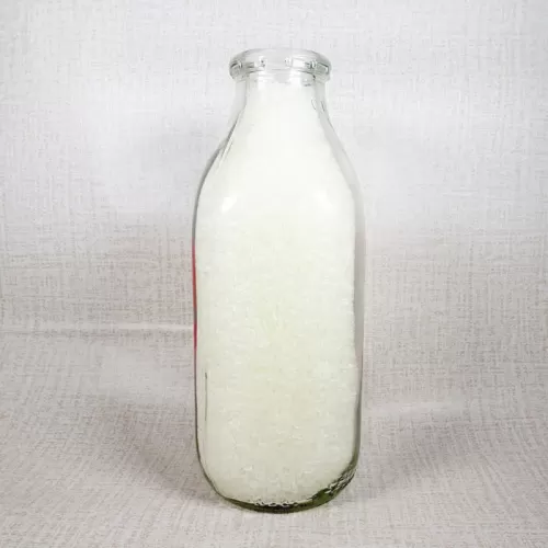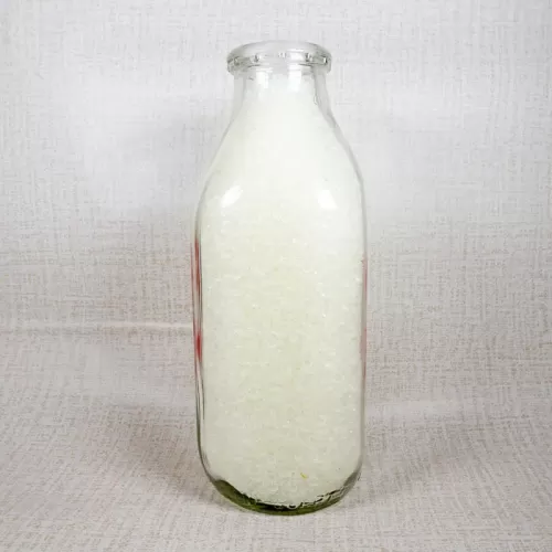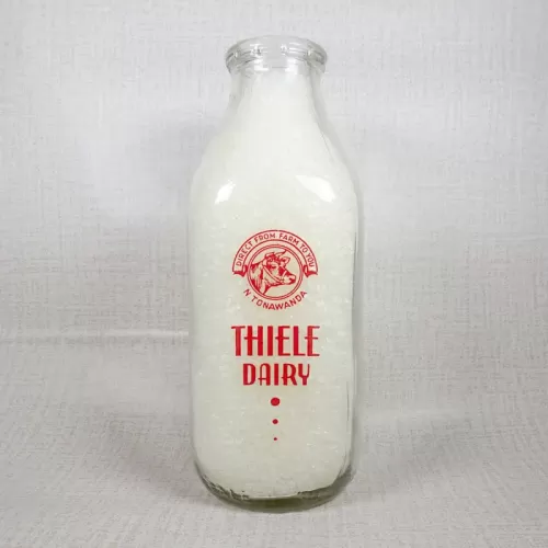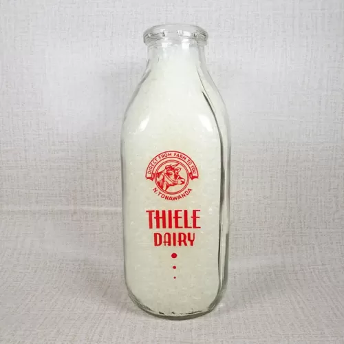 Thiele Dairy vintage clear glass acl one quart milk bottle with nice red graphics