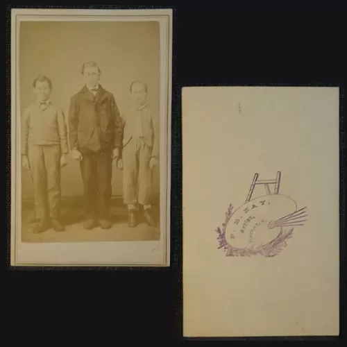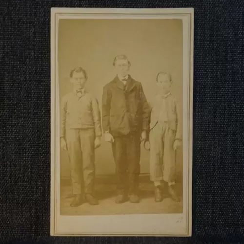 Image of three boys standing in a row with the tallest, in dark clothes, in the center.