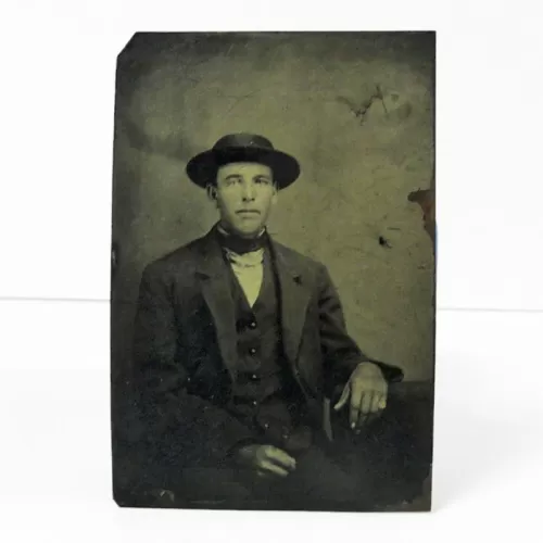 Man sitting wearing a button down vest with jacket and a flat hat and pinkie ring. One arm rest on the chair arm while the other rest in his lap