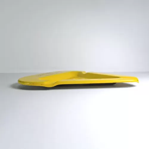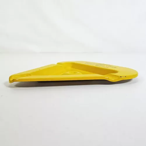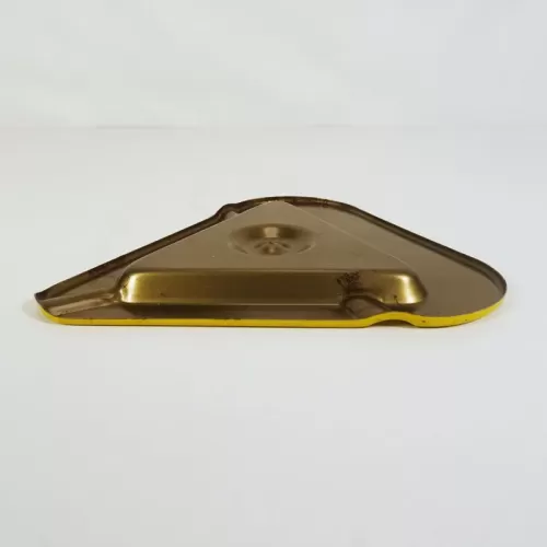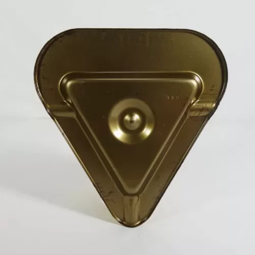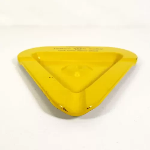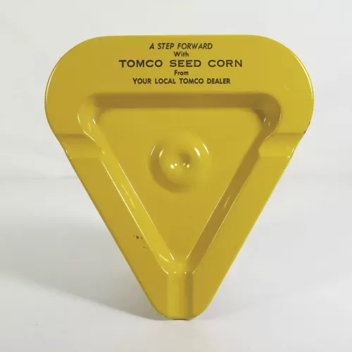 Tomco Seed Corn vintage metal ashtray. Triangular in shape with dark yellow background, the color of corn, and black graphics. Three cigarette rest add the look
