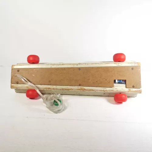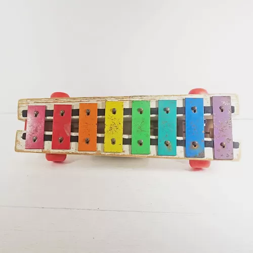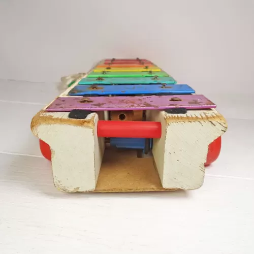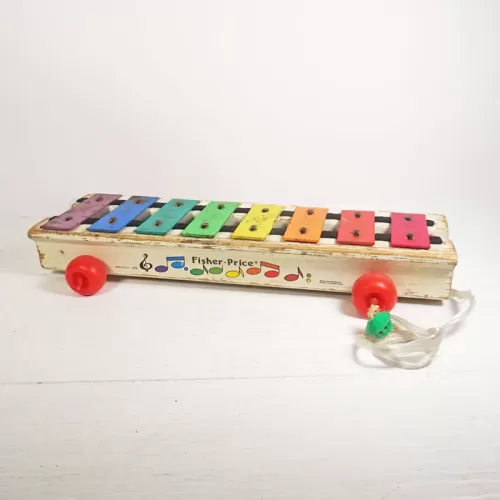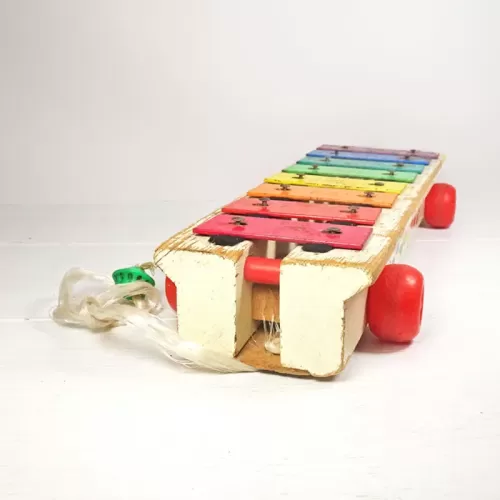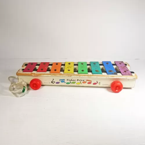 Vintage Fisher Price musical xylophone pull toy with pull string that plays music when rolled on its plastic wheels.