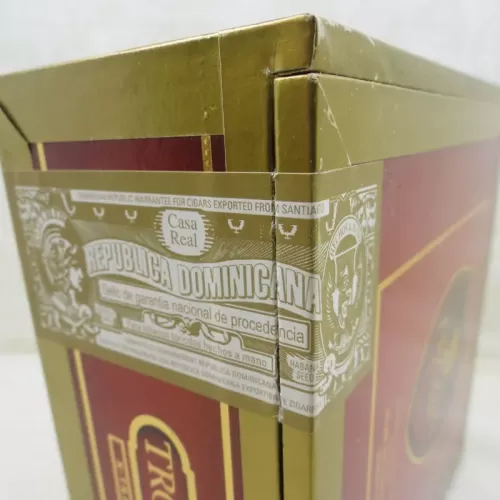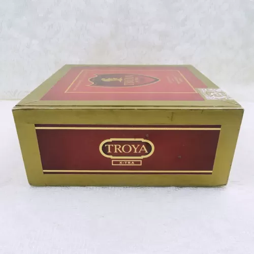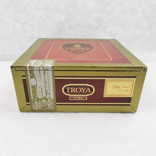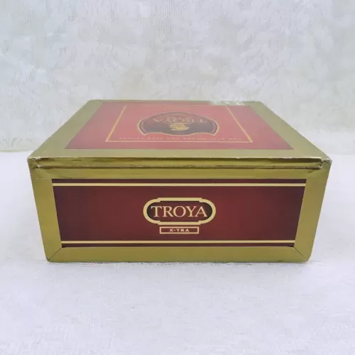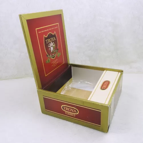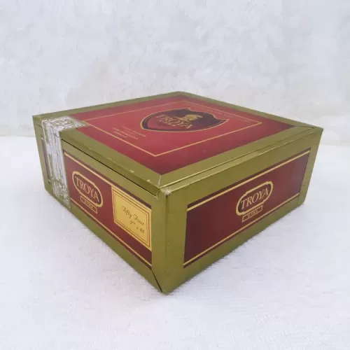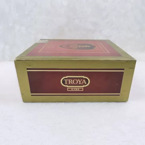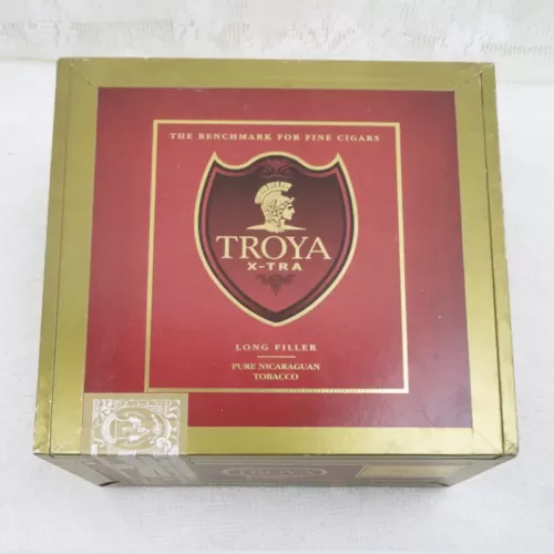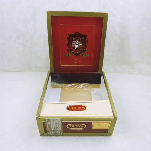 Troya x-tra long filler empty wood cigar box featuring dark red and gold paper covering