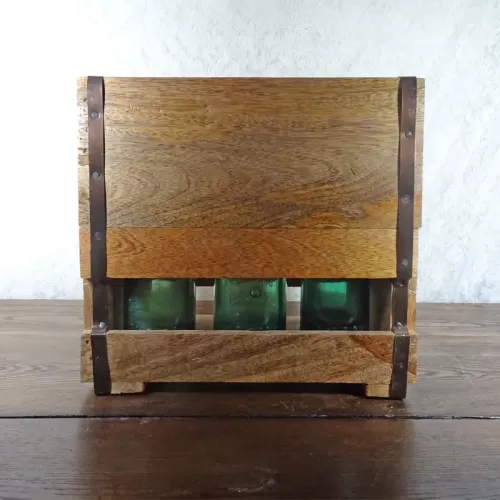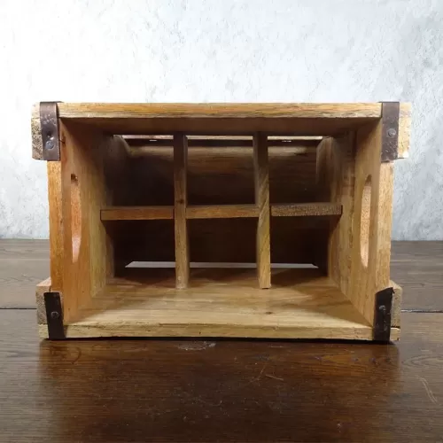 Six bottle vintage wood box caddy with nailed metal straps and cutout half circle handles. Opening in the front to see the bottles.