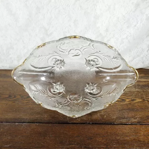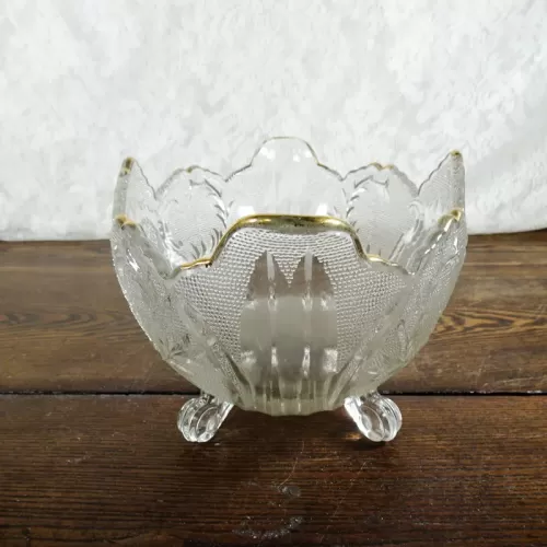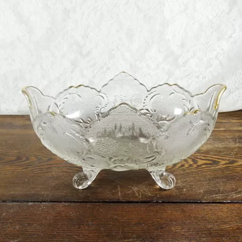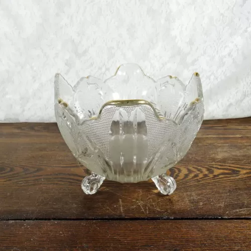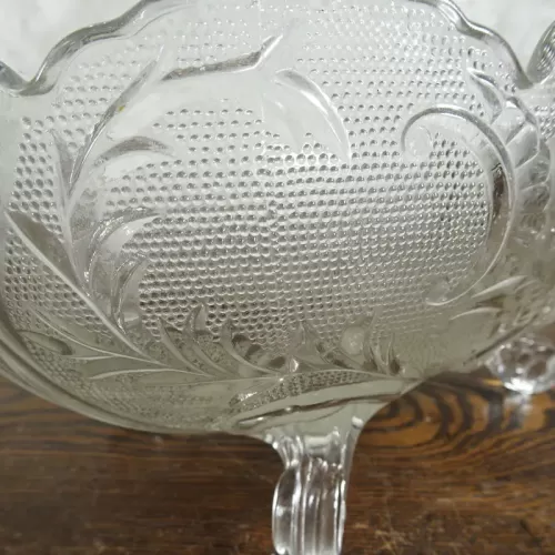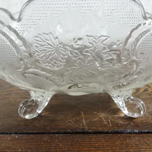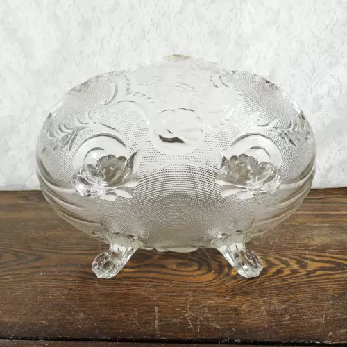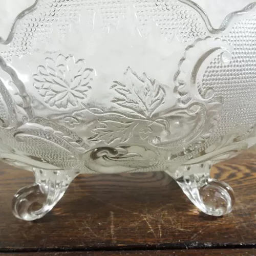 Vintage fruit bowl compote with four short legs composed of clear glass with beautiful designs throughout
