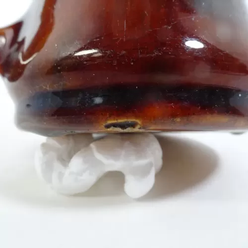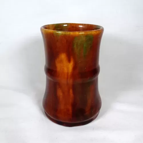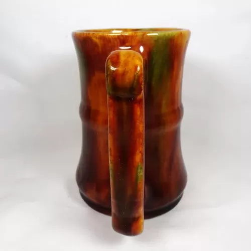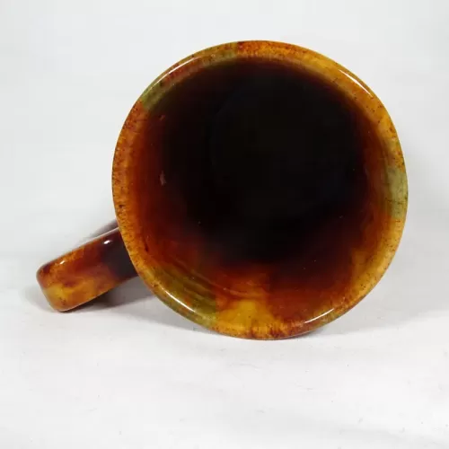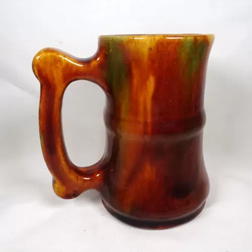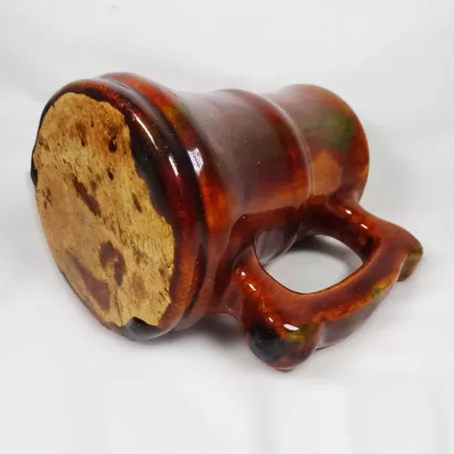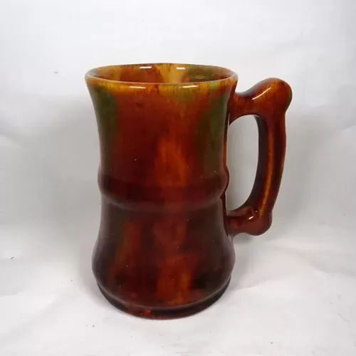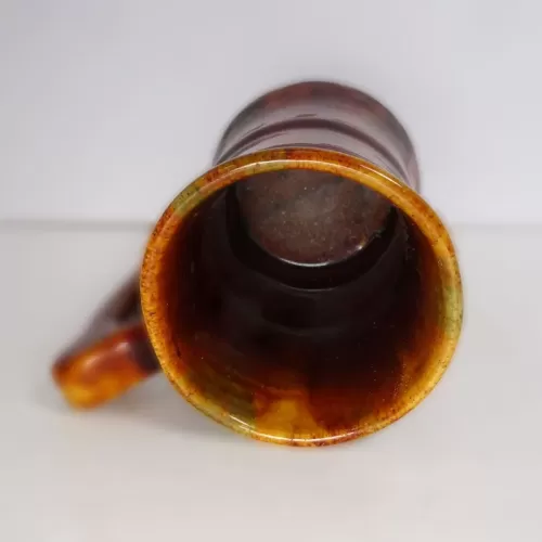 Vintage brown glazed stoneware mug with finger stop handle featuring a band around the middle and subtle color changes throughout.