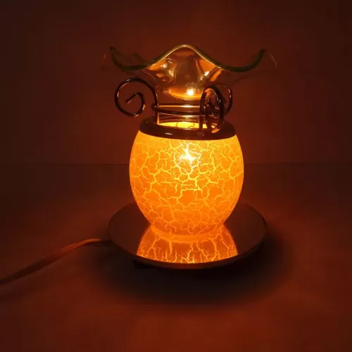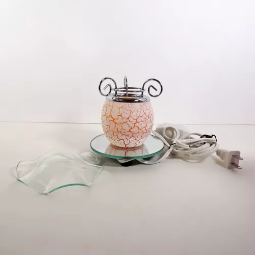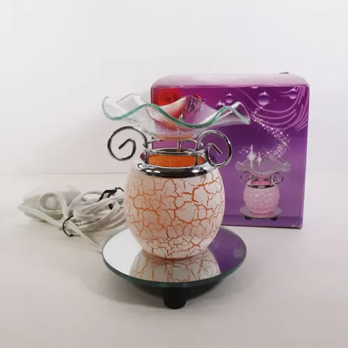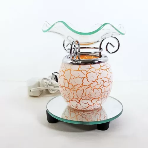 Electric oil or tart warmer featuring a white crackle design with a rusty orange background. A round mirror base completes the look.