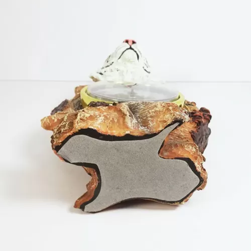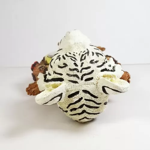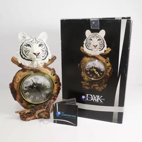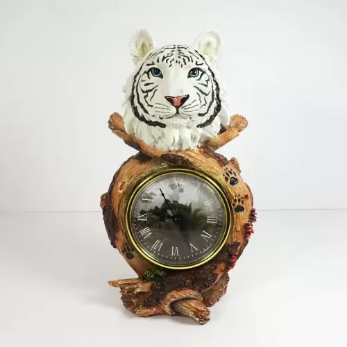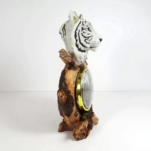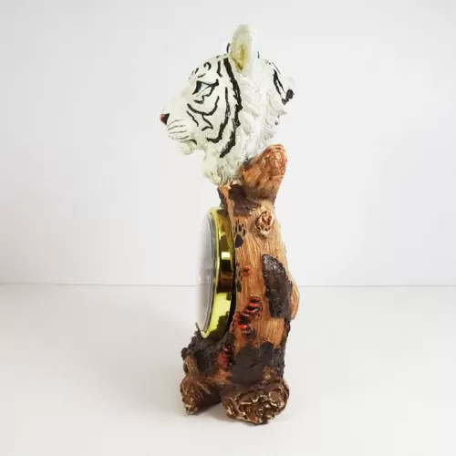White Tiger head figurine table quartz clock featuring a white tiger head figurine atop branches with paw prints and what looks like catepillars. Roman numerals continue the look