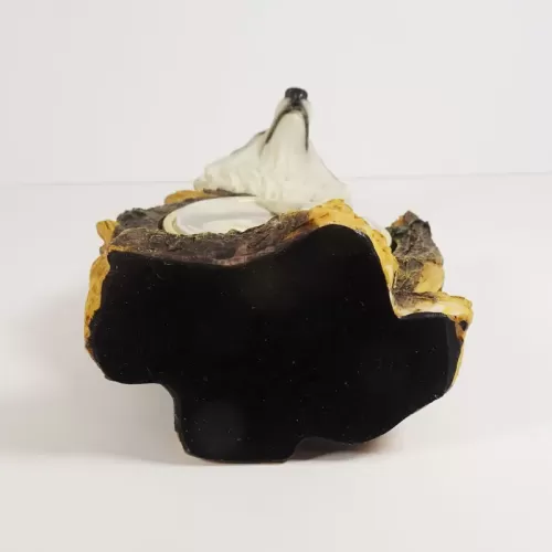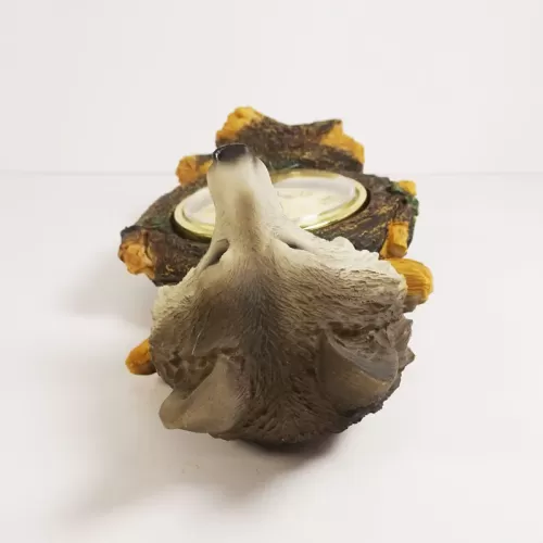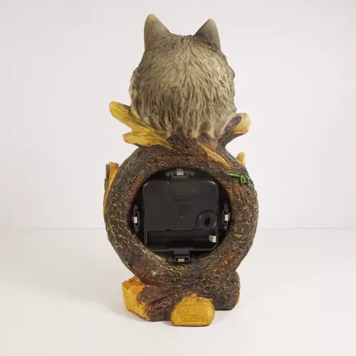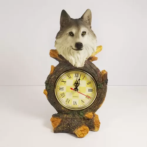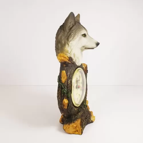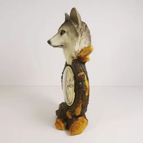 Wolf head figurine novelty table quartz clock featuring a wolf head figurine atop branches with vines growing thru them. Roman numerals continue the look