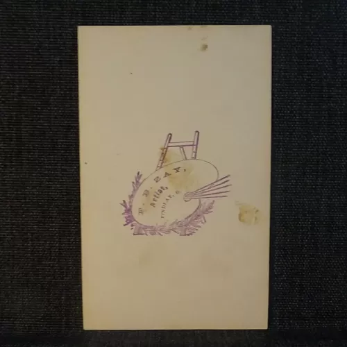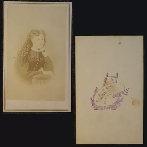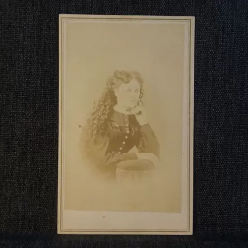 Image of a woman from the waist area up with long curly hair. One hand placed near her chin, elbow and the other arm resting on the back of a chair or some sort of prop