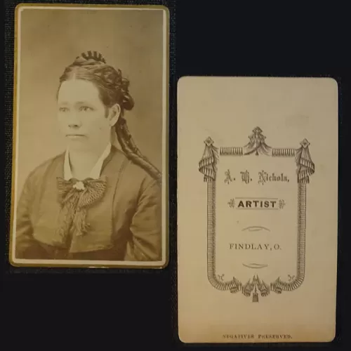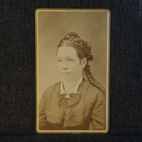 Image of a woman from the waist area up with tight ringlet curls and a straight line smile sporting a bow tie