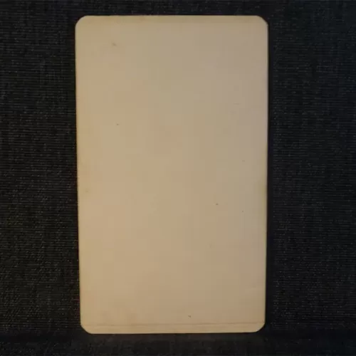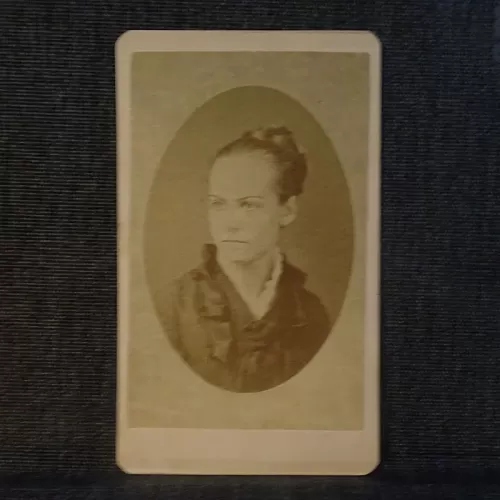 Image of a woman from the shoulder area up with a braided bun atop her head, straight line smile and ruffled collar